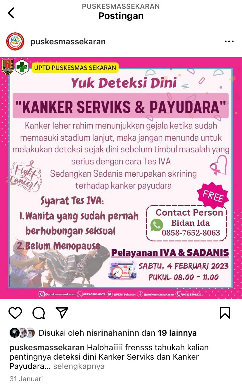 Gerakan Pencegahan dan Deteksi Dini Kanker pada Perempuan Indonesia ini dilaksanakan selama 5 tahun di seluruh Indonesia, dimana pencanangan dilakukan oleh Ibu Negara pada tanggal 21 April 2015 di Puskesmas Nanggulan,Kabupaten Kulonprogo, Provinsi DI Yogyakarta. Rangkaian kegiatan meliputi kegiatan promotif, preventif , deteksi dini, dan tindak lanjut. Melalui kegiatan ini diharapkan kesadaran dan kepedulian masyarakat terutama dalam mengendalikan faktor risiko kanker dan deteksi dini kanker sehingga diharapkan angka kesakitan dan kematian akibat penyakit kanker dapat ditekan. Seluruh fasilitas kesehatan dasar di Indonesia melakukan gerakan pencegahan kanker termasuk Puskesmas Sekaran. Gerakan ini di laksanakan di puskesmas namun dengan sedikitnya minat sasaran maka puskesmas kami melakukan pendekatan sibantu oleh kader dengan cara mendatagi sasaran dan melaksanakan IVA serta SADANIS di rumah warga tersebut yang kemudian kegiatan ini disebut dengan Inovasi RIVA CERDIK.