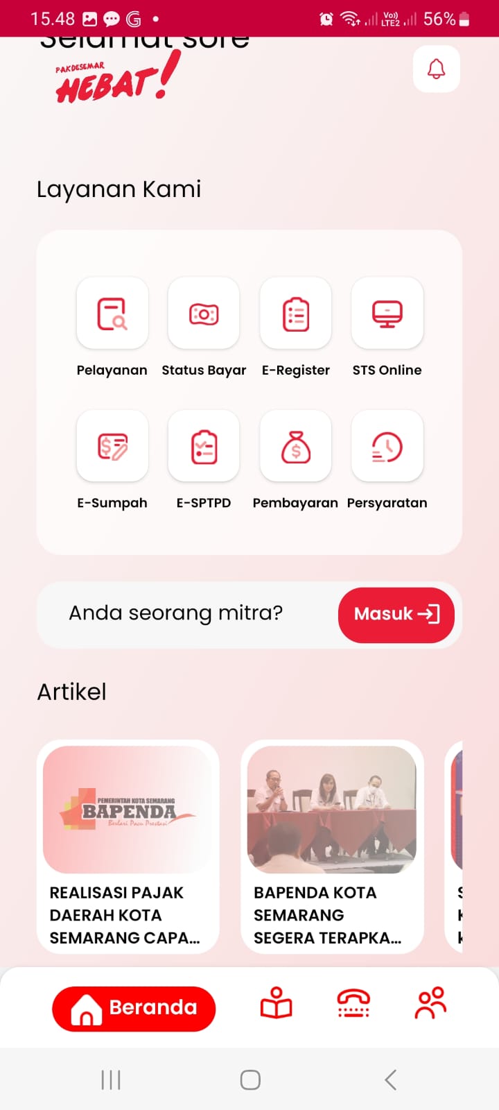 Dasar Hukum : Peraturan Walikota (PERWALI) Kota Semarang Nomor 59 Tahun 2018 tentang Perubahan Peraturan Walikota Semarang Nomor 12 Tahun 2018 Tentang Pelaporan, Pembayaran Dan Pengawasan Pajak Daerah Melalui Sistem Elektronik (Berita Daerah Kota Semarang Tahun 2018 Nomor 59) Permasalahan : upaya mengatasi dan menjawab keluhan masyarakat terkait dengan kurang optimalnya pelayanan perpajakan daerah di Kota Semarang dalam bentuk Aplikasi Mobile Phone Isu global : dengan adanya pandemi covid-19 yang membatasi ruang gerak masyarakat sehingga dipandang pelu melakukan pelayanan tanpa perlu tatap muka langsung dengan wajib pajak Metode Pembahasan : dengan adanya aplikasi ini berdampak pada realisasi kenaikan penerimaan pajak daerah dan kenaikan jumlah wajib pajak Keunggulan dan kebaharuan : 1. Tahun 2021 : aplikasi ini dapat melayani semua pelayanan perpajakan daerah bagi masyarakat khususnya pengguna android 2. Tahun 2022 : aplikasi ini dapat melayani semua pelayanan perpajakan daerah bagi masyarakat pengguna android dan ios Tahapan Inovasi : Fitur yang terdapat dalam Pakde Semar Hebat adalah sebagai berikut : a. Lacak pelayanan : Dipergunakan untuk memantau status pelayanan Pajak Bumi dan Bangunan b. Status pembayaran : Dipergunakan untuk melihat status dan informasi pembayaran Pajak Daerah dan dapat mencetak SKL PBB dan Kode Bayar Pajak Daerah. c. e-register : Dipergunakan untuk melakukan permohonan dan pendaftaran Pajak Non PBB & BPHTB secara Online d. e-sumpah : Untuk melakukan permohonan dan Pendaftaran Pelayanan PBB melalui elektronik e. e-sppt : Melalui Menu E – SPPT masyarakat dapat memerima SPPT secara elektronik f. e-SPTPD : Melalui Menu E – SPPT masyarakat dapat memerima SPPT secara elektronik g. pencetakan : Dipergunakan untuk melakukan percetakan Formulir Permohonan Pelayanan PBB, dan Pendaftaran Pajak Non PBB & BPHTB h. pencetakan : dipergunakan untuk Wajib Pajak mendapatkan LINK Pemabayaran melalui Perbankan dan Uang Elektronik yang telah bekerjasama dengan Bapenda i. persyaratan : Dipergunakan untuk mempermudah Wajib Pajak Bumi dan Bangunan tentang persyaratan permohonan PBB j. panduan : Dipergunakan untuk mempermudah Wajib Pajak tentang tata cara melakukan Pembayaran Pajak Daerah j. unduhan : Dipergunakan untuk Wajib Pajak mengunduh formulir permohonan layanan PBB k. sosial media dan hotline : Dipergunakan sebagai sarana untuk Wajib Pajak Daerah dalam melaporkan keluhan – keluhan berkaitan dengan Pajak Daerah