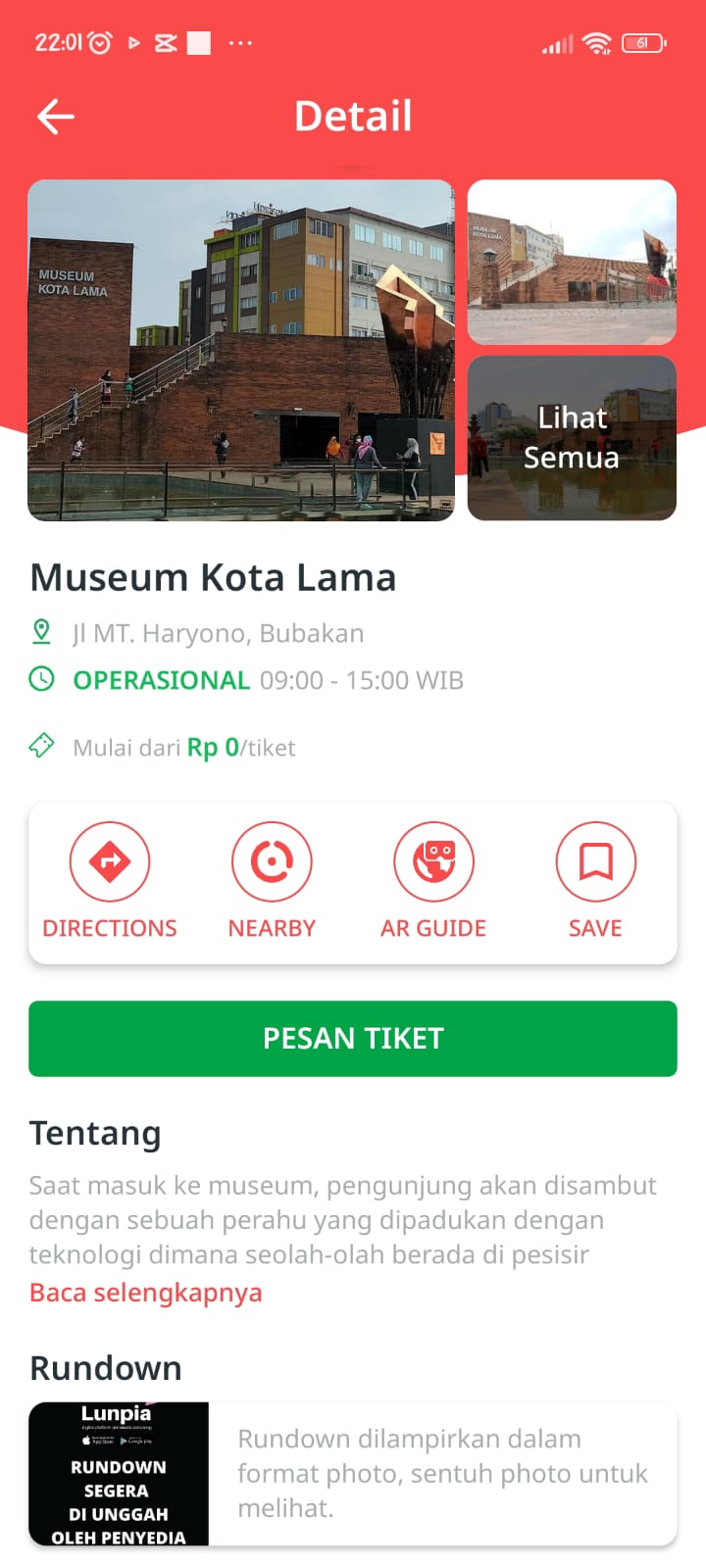 Kegiatan ini dilaksanakan berdasarkan SK Kepala Dinas Kebudayaan dan Pariwisata Kota Semarang Tentang Pelaksanaan Implementasi Inovasi Pemanfaatan Aplikasi Lunpia. Permasalahan yang di dapatkan belum ada aplikasi online untuk reservasi Museum Kota Lama, Isu Strategis Mengikuti Perkembangan Digitalisasi Sistem Pelayanan Usaha Pariwisata, Metode pembaharuan dengan menambahkan fitur Pesan Tiket masuk Museum Kota Lama pada Aplikasi LUNPIA