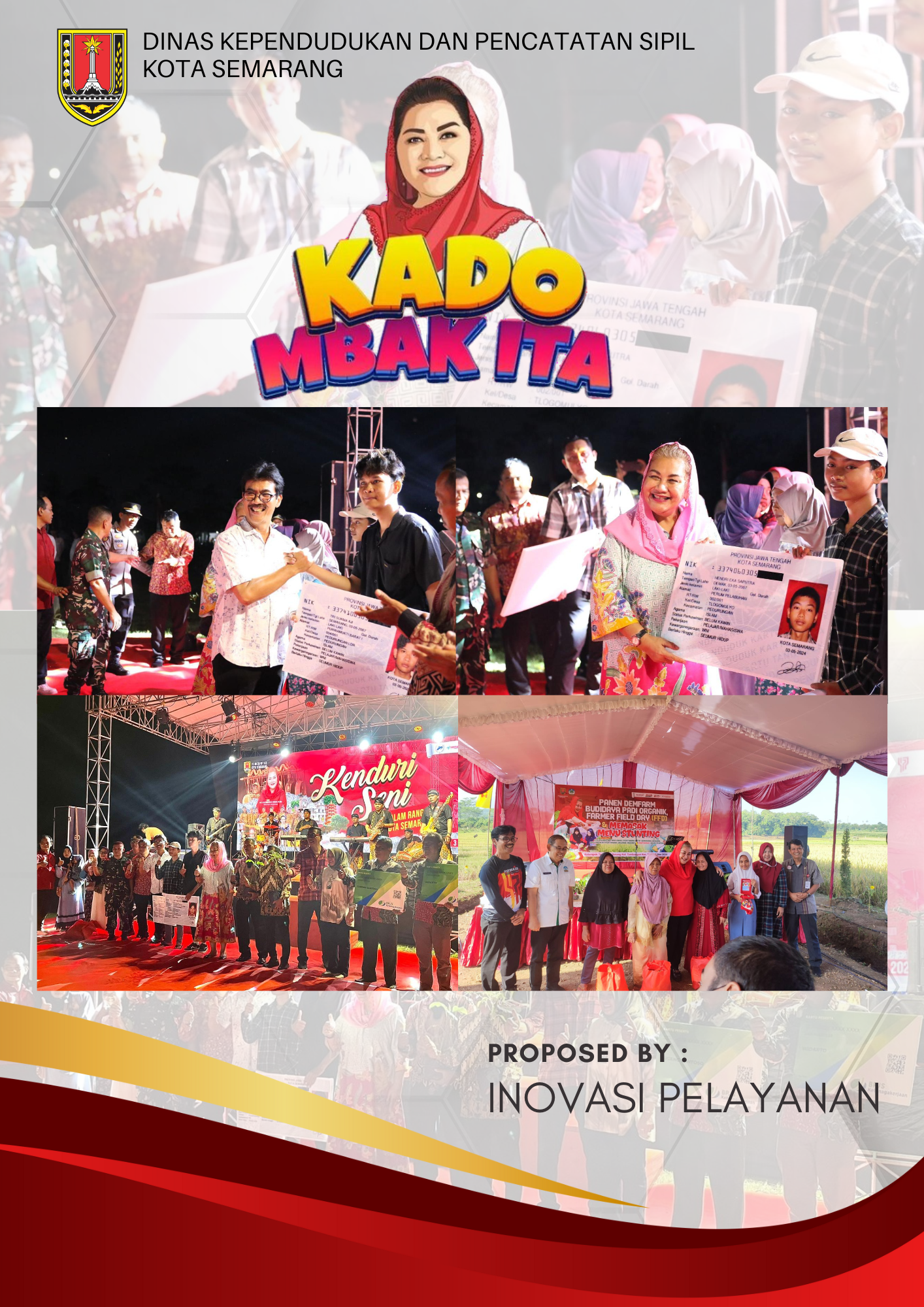 Untuk mencapai target kepemilikan KTP di Kota Semarang, salah satu inovasi yang dilaksanakan Dinas Kependudukan dan Pencatatan Sipil Kota Semarang adalah KADO MBAK ITA (KAnugrahan DOkuMen BAru Kagem Penduduk pItulas Tahun) yaitu bagi warga Kota Semarang yang berulang tahun 17 tahun dan sebelumnya sudah direkam biometrik atau iris mata, akan mendapatkan kiriman KADO MBAK ITA.