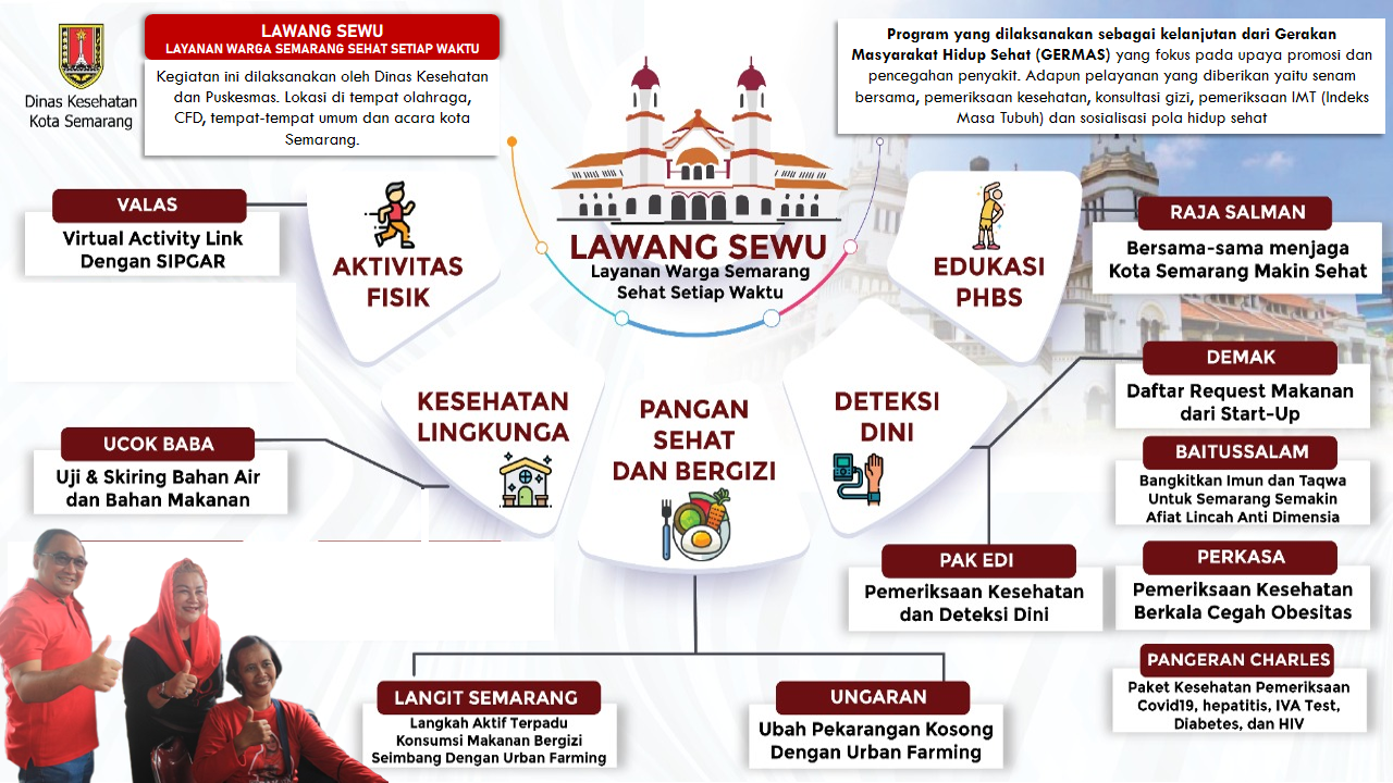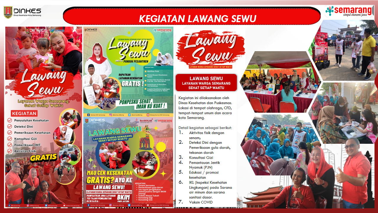 Layanan Warga Semarang Sehat Setiap Waktu (LAWANG SEWU) dikembangkan sebagai implementasi dari dari Gerakan Masyarakat Hidup Sehat (GERMAS), dengan berfokus pada upaya promosi dan pencegahan penyakit. LAWANG SEWU merupakan salah satu upaya untuk mendukung SDGs no.3 yaitu Kehidupan Sehat dan Sejahtera melalui upaya pencegahan dan pengendalian penyakit terutama PTM pada kelompok usia produktif di Kota Semarang dan memberikan stimulus kepada masyarakat tentang pentingnya menjaga kesehatan.