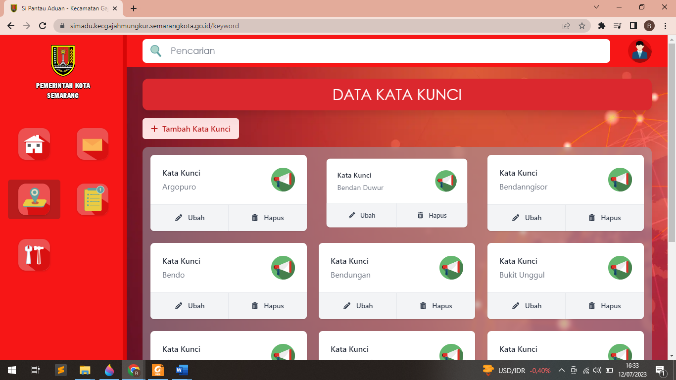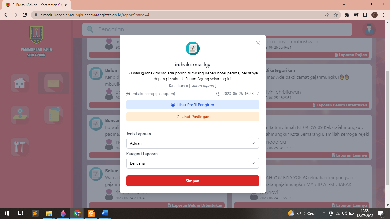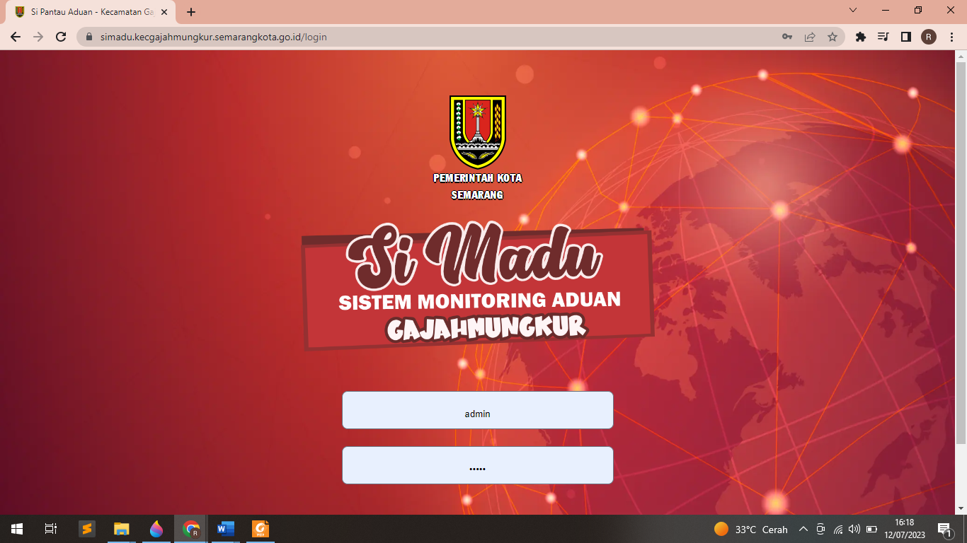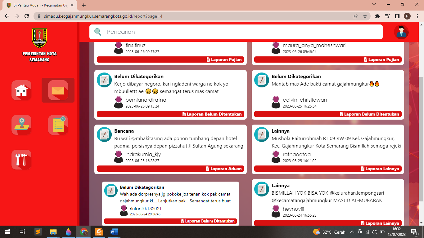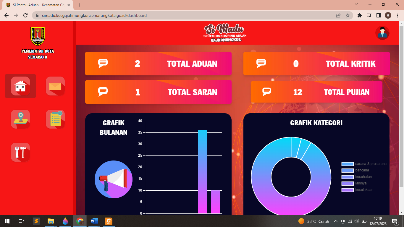 Aplikasi ini merupakan pengembangan dari aplikasi BOT Instagram, dengan tampilan yang baru aplikasi ini mempunyai keunggulan dari aplikasi sebelumnya, fungsi dari aplikasi masih sama dengan aplikasi sebelumnya, namun aplikasi ini mempunyai kelebihan yaitu dapat mem-filter aduan lebih dari satu media sosial (multi platform), berikut penjelasan tampilan aplikasi Login Aplikasi User disini yaitu Admin Kecamatan (OPD), yang nantinya user tersebut menerima notifikasi, kemudian mengklasifikasikan aduan menurut kategori Dashboard Aplikasi Berikut tampilan Dashboard Aplikasi, yang berisi grafik aduan yang masuk Laporan Aduan Berikut adalah tampilan aduan warga yang terfilter secara otomatis oleh sistem Profil Pelapor dan Link Komentar di Postingan Instagram Berikut tampilan dari Detail Aduan, dengan tampilan ini, aplikasi akan mengarahakan user untuk dapat dengan mudah mencari profil dan komen pelapor Menu Keyword Aduan Berikut tampilan Keyword (data kunci) jika ingin ditambahkan dapat mengklik tombol tambah Kata Kunci Menu Tambah Jenis Laporan Berikut tampilan Jenis Laporan aduan, jika ingin ditambahkan dapat mengklik tombol tambah Jenis Laporan Menu Tambah Kategori Laporan Berikut tampilan kategori aduan, jika ingin ditambahkan dapat mengklik tombol tambah Kategori DOKUMENTASI PEMBUATAN APLIKASI Aplikasi Si Madu (Sistem Monitoring Aduan) Kecamatan Gajahmungkur adalah sebuah platform website dan bot otomatisasi untuk meningkatkan efektivitas, efisiensi, serta mempercepat proses penganganan aduan dengan cara memantau secara otomatis aduan warga yang disampaikan melalui kolom komentar di akun Instagram milik pemerintah Kota Semarang. Bila terdeteksi adanya aduan, sistem Si Madu akan memberikan notifikasi WA kepada admin sosmed Kecamatan Gajahmungkur Bila terdeteksi adanya aduan, sistem Si Madu akan memberikan notifikasi WA kepada admin sosmed Kecamatan Gajahmungkur. Admin sosmed Kecamatan Gajahmungkur memberikan respon awal terlebih dahulu. Admin sosmed Kecamatan Gajahmungkur menyampaikan kepada pemangku wilayah (kelurahan) bahwa ada aduan masuk Kelurahan menindaklanjuti aduan dengan meninjau lokasi dan melakukan asesmen terhadap aduan Bila kelurahan tidak mampu menangani aduan atau diluar kewenangan, maka kelurahan akan berkoordinasi dengan Dinas terkait Tindak lanjut penyelesaian dari Dinas terkait atau Kelurahan. Admin sosmed kecamatan Gajahmungkur membuat publikasi terhadap penyelesaian aduan Respon positif dari pelapor terhadap tindak lanjut penyelesaian aduan