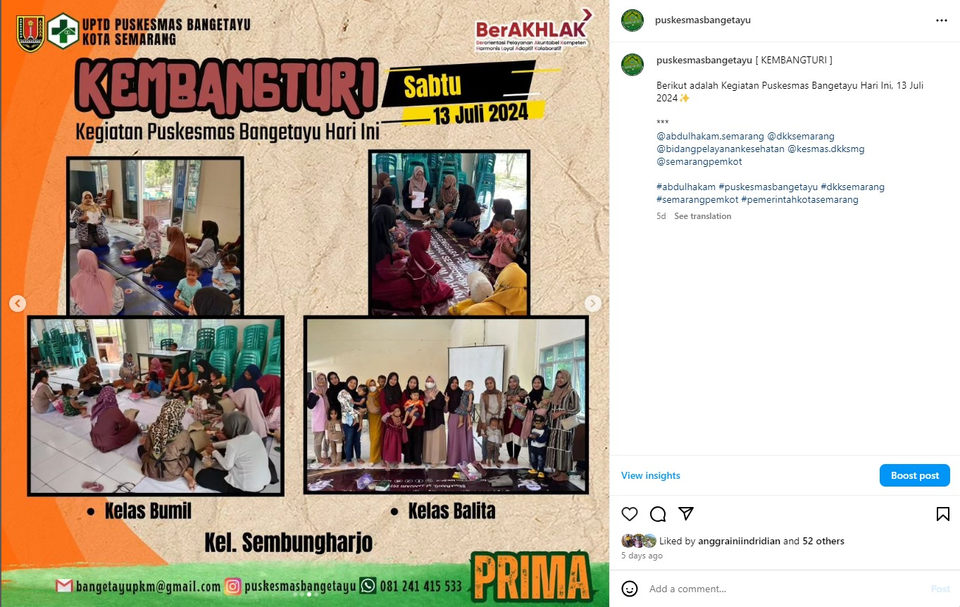 Setelah dilaksanakan, inovasi KOLAK LABU telah memberikan dampak positif bagi peningkatan pelayanan upaya kesehatan masyarakat Puskesmas Bangetayu, antara lain ditunjukkan dengan kondisi sebelum (before) and sesudah (after) berbasis indikator kinerja sebagai berikut: NO Indikator Capaian 2023 APR MEI JUNI JULI AGUSTUS SEPTEMBER 1 Hadir di kelas ibu hamil 27 60 60 53 60 60 Persentase kasus Sebelum Sesudah Sebelum Sesudah Sebelum Sesudah Sebelum Sesudah Sebelum Sesudah Sebelum Sesudah 2 Ibu hamil anemia 48,1% 29,6% 23,3% 11,6% 28,3% 16,6% 24,5% 16,9% 26,6% 21,6% 26,6% 18,3% 3 Ibu Hamil KEK 25,9% 18,5% 31,6% 22,6% 43,4% 36,6% 33,9% 28,3% 25% 23,3% 23,3% 20% Berdasarkan data di atas dapat disimpulkan bahwa pelaksanaan KOLAK LABU dibuktikan dengan menurunnya angka anemia dan KEK pada ibu hamil. Kondisi ini membawa manfaat yang sangat luas di masyarakat. Masyarakat mendapatkan pelayanan kesehatan secara lebih komprehensif, efektif dan lebih dekat dengan masyarakat.