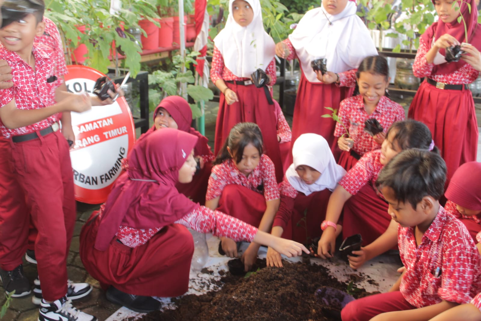 Bapak Camat Semarang Timur Drs. Kusnandir, MM beserta Penyuluh Pertanian Lapangan Semarang Timur Nur Wahyuni Ekowati sebagai pemandu dalam mengajarkan para siswa mengolah tanah, menyiapkan polybag sesuai ukuran tanaman, serta tanaman apa yang sesuai untuk ditanam dalam lahan atau pekarangan rumah kita masing-masing.