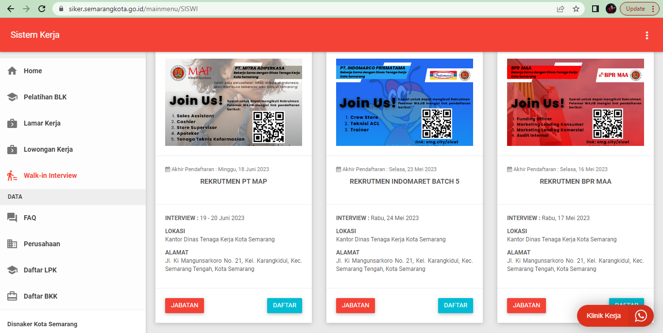 Sistem Walk in Interview dilaksanakan berdasarkan Perwal No 20 Tahun 2021 tentang Aplikasi Sistem Informasi Pasar Kerja Terbuka dan Terpadu (APIK KERJAKU) dan SK Nomor 560/1926/VIII/2022 tentang SK Pembentukan Tim IT Pengembangan Inovasi Walk In Interview (SISWI) bagi Pencari Kerja di Dinas Tenaga Kerja Kota Semarang Tahun 2022.